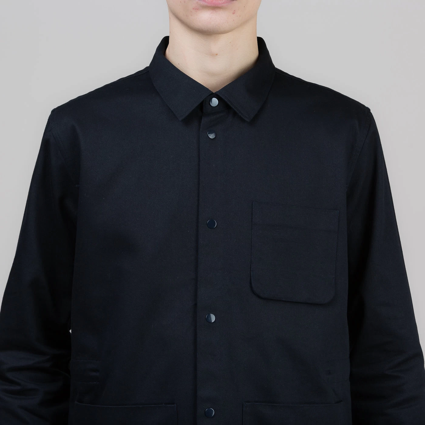 > Metal snap stud fastening at hem, collar stand and cuffs.