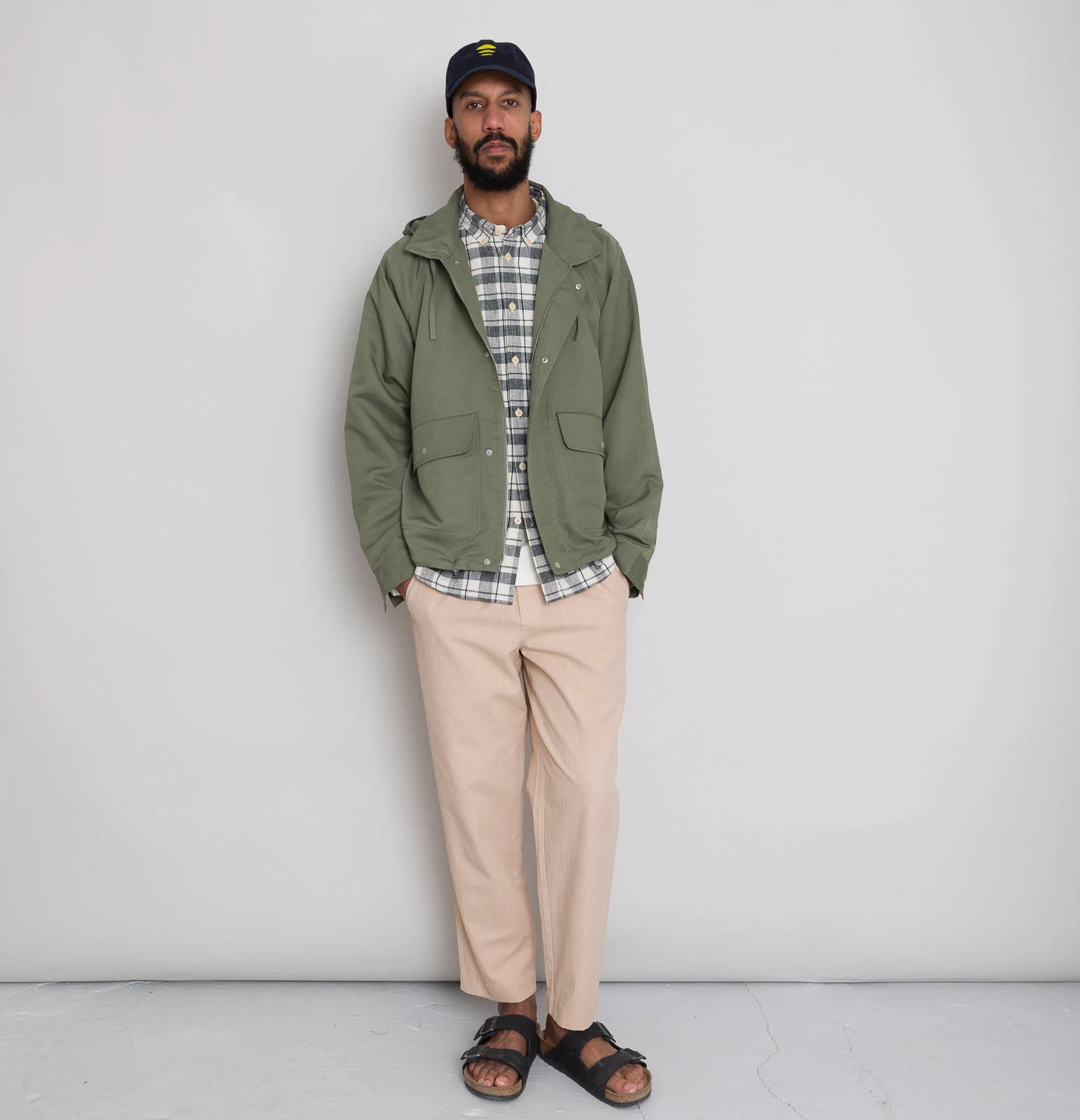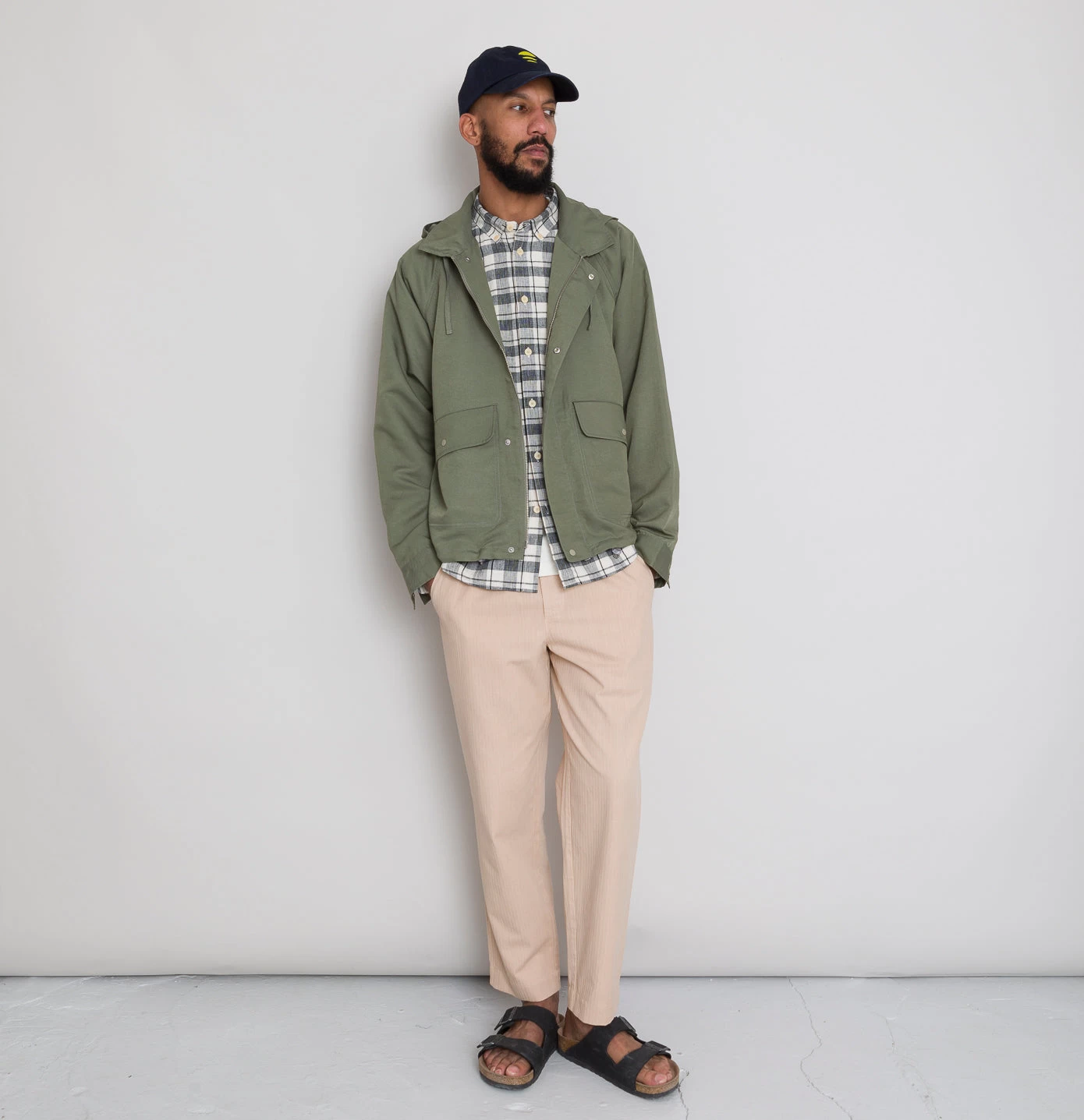 Straight welt pockets at back with profile stitch detail.
