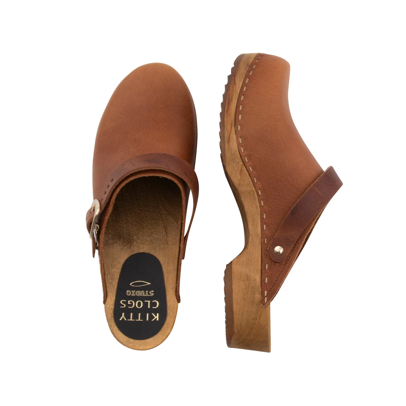 Our Low Klassisk clog with strap has stapled leather uppers with a rounded toe, an open back and an adjustable strap to the back. The strap can be worn around the ankle for added support or as a detail over the front. The dark Alder wood base has a low 30mm heel. All of our wooden bases are ergonomically shaped inside and out for comfort and have a rubber grip on the sole. With time and wear both the leather and wooden base will soften and begin to mould to the shape of your foot.