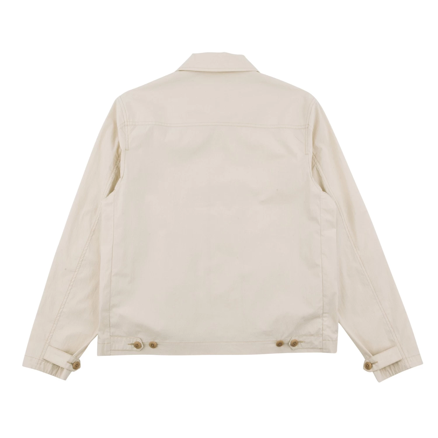 Tab adjusters at cuffs and hem with corozo nut button fastening.