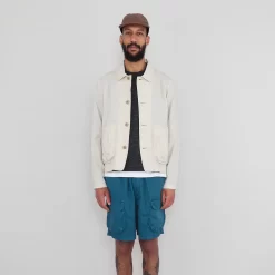 Tab adjusters at cuffs and hem with corozo nut button fastening.