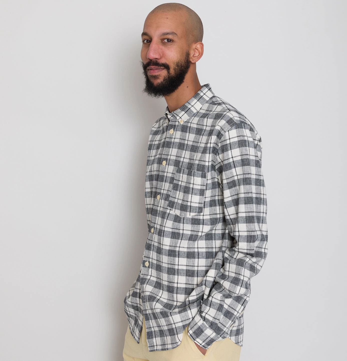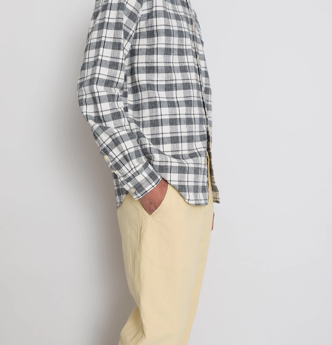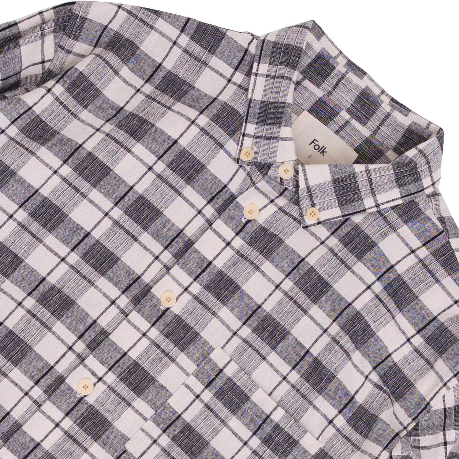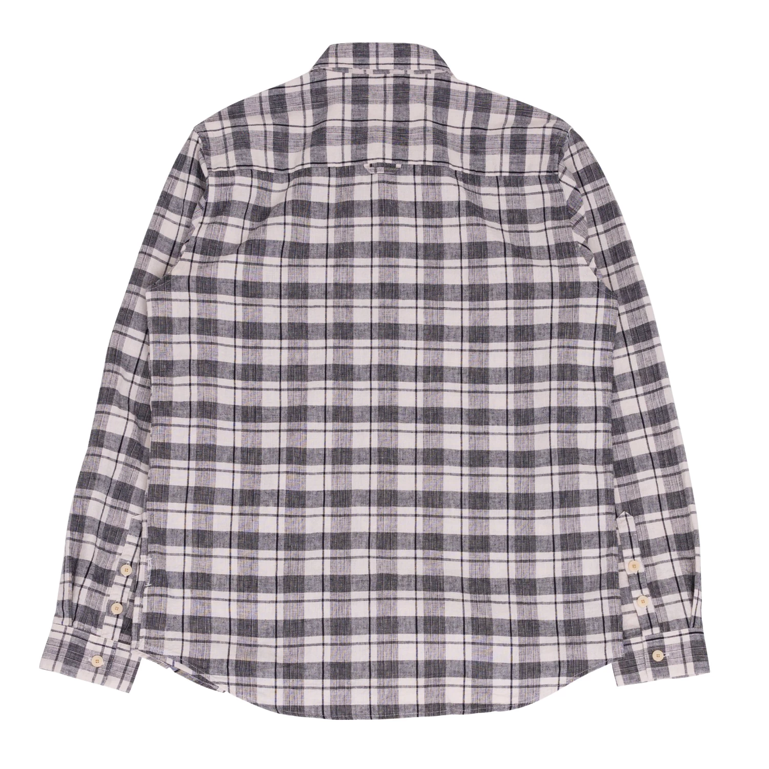 Grown on centre front button placket and button cuff and cuff placket.