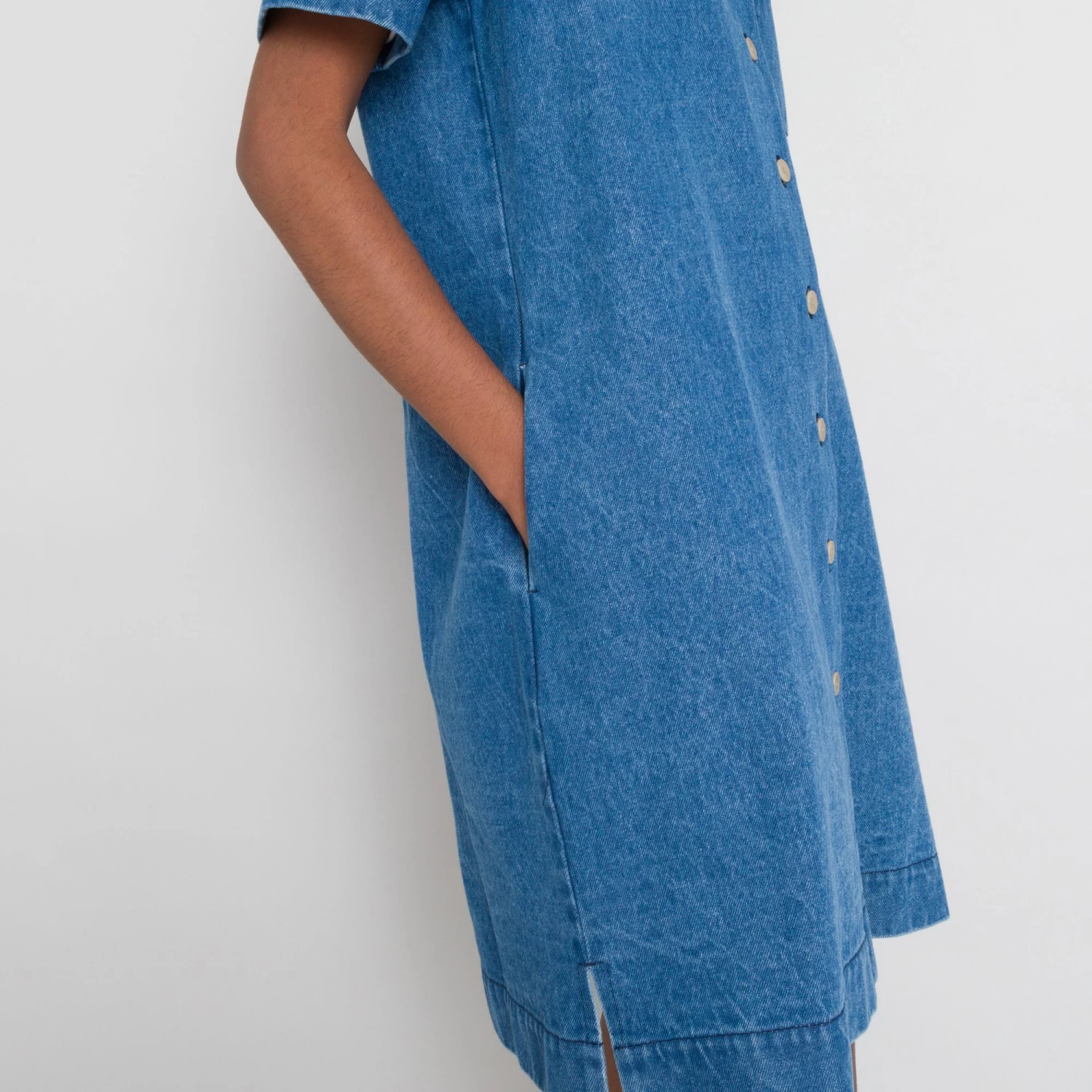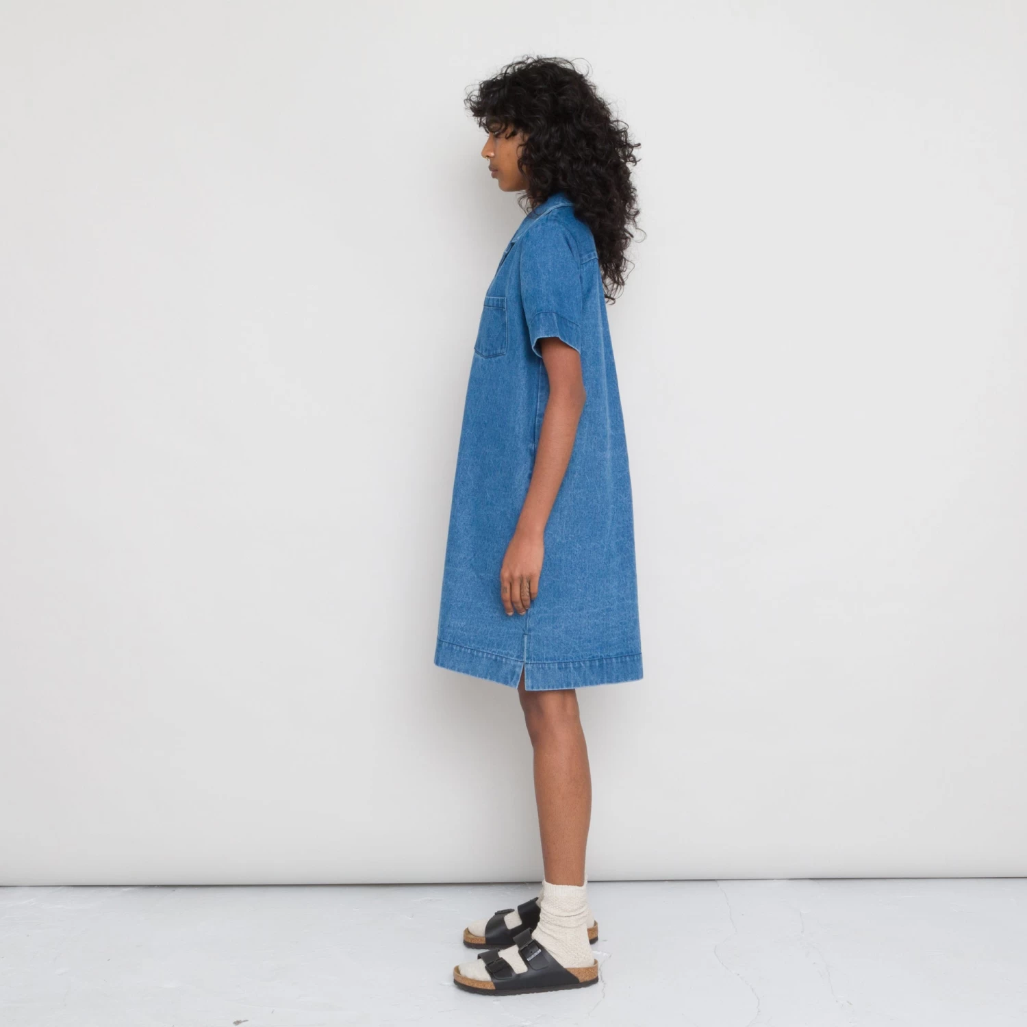 Fabricated in a denim with a light bleach wash and contrast stitching.