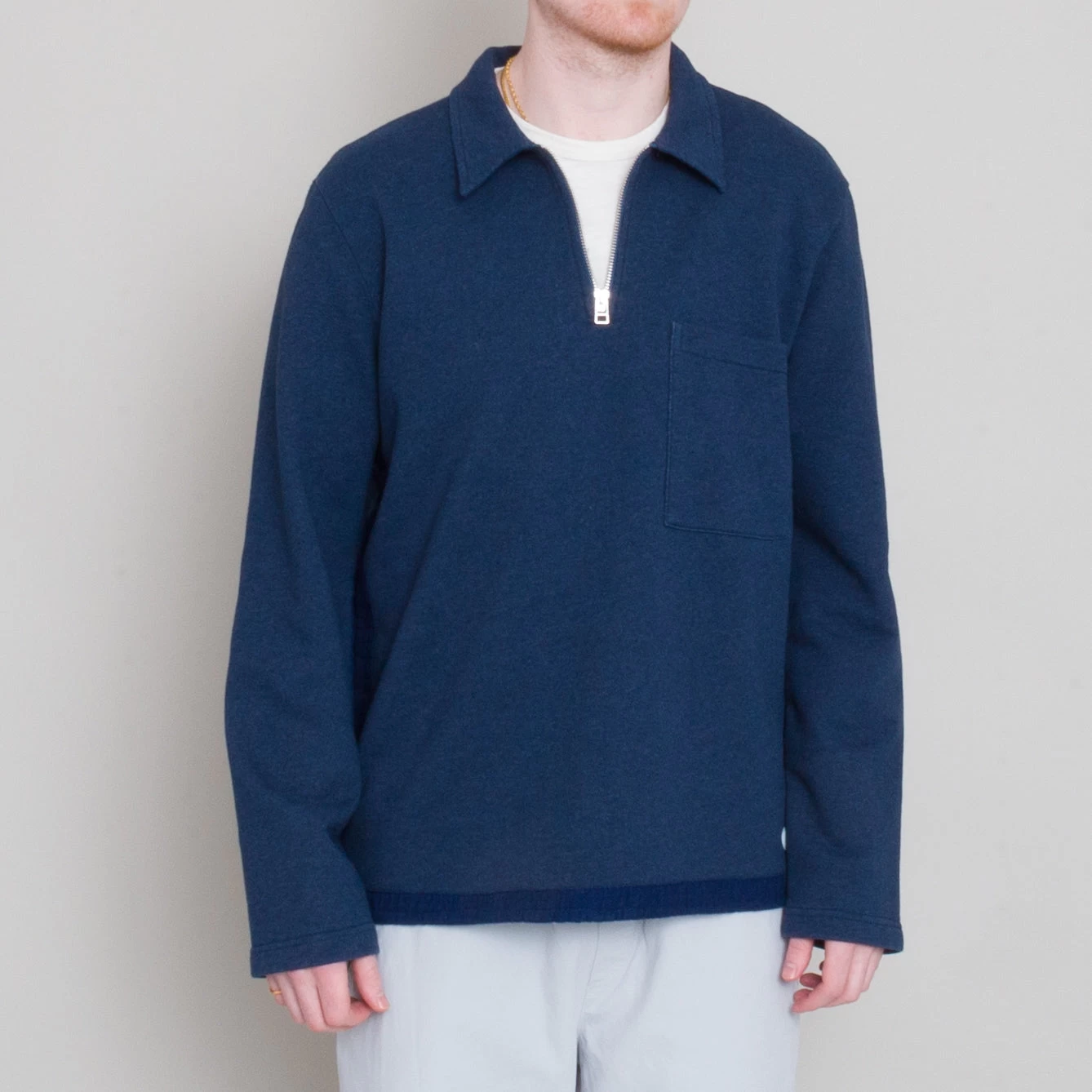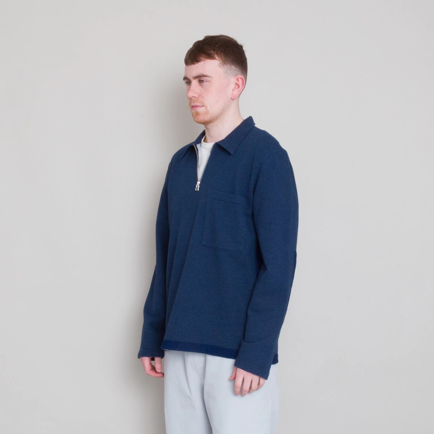 Half zip, overhead style in a compact, dry handle sweat fabrication.