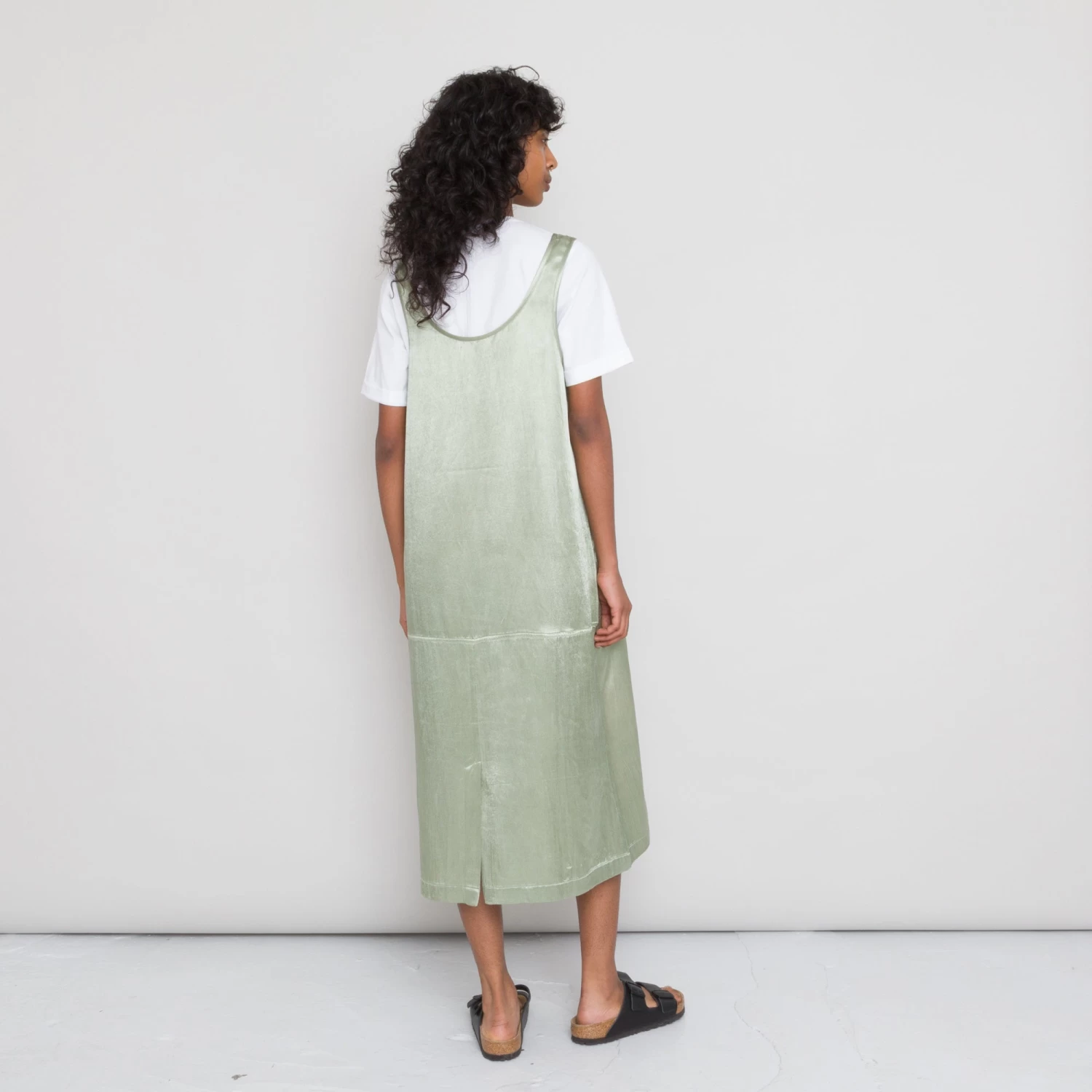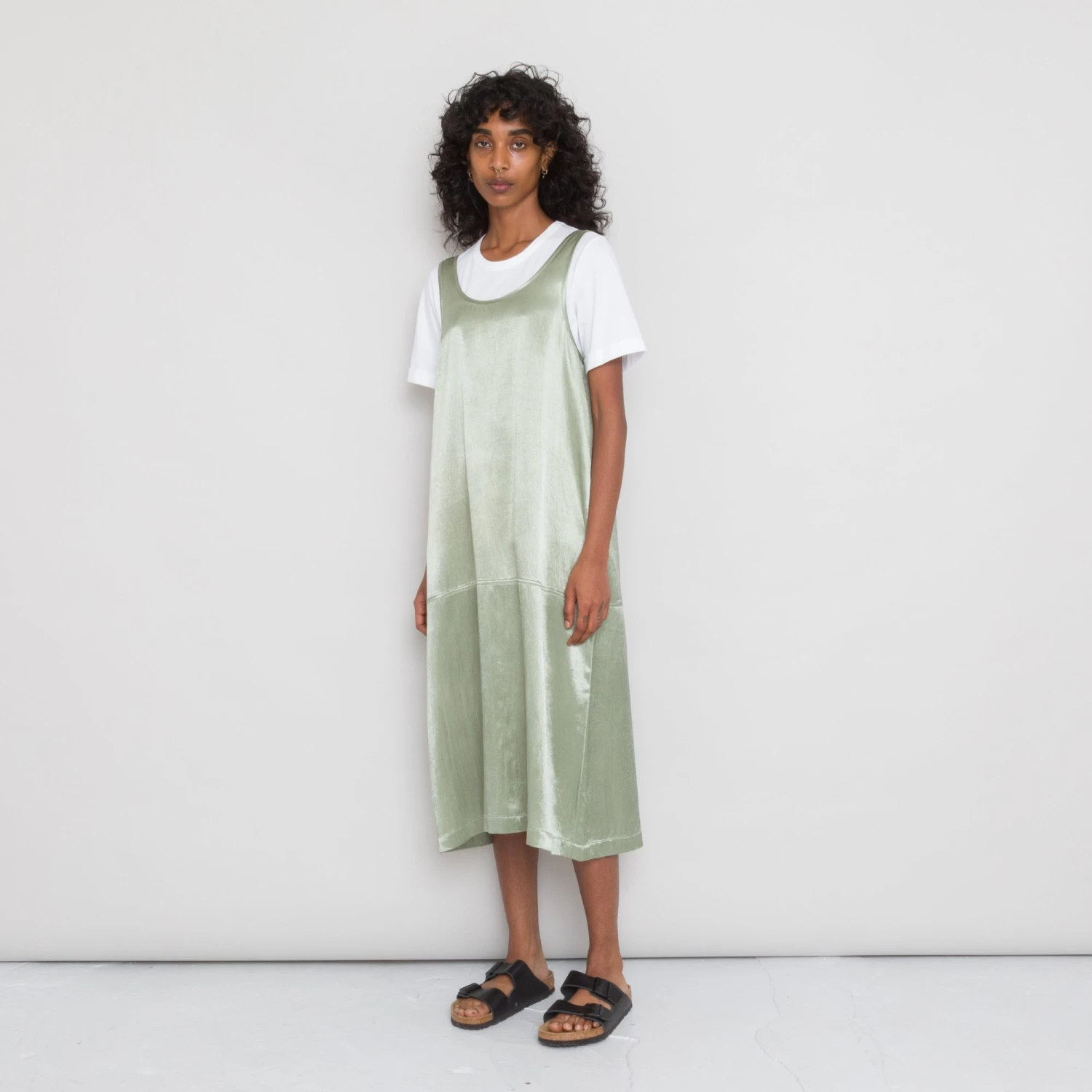 Classic slip dress in satin with thick straps that can conceal bra straps.